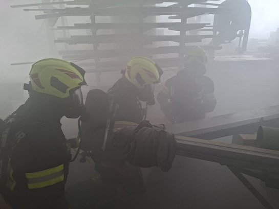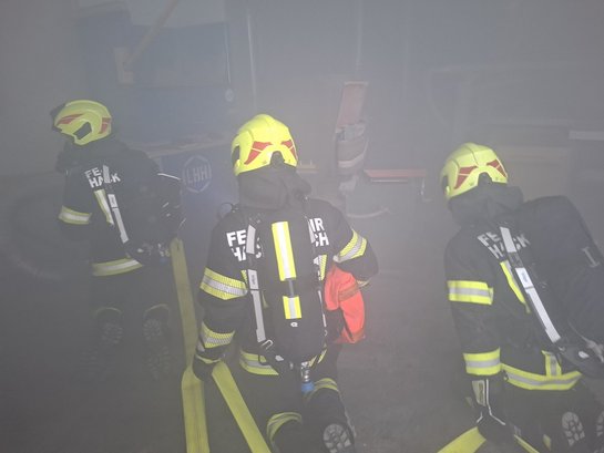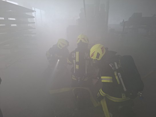Die Übungsannahme war ein Brand einer Absauganlage. Durch die starke Rauchentwicklung sowie das rasche Ausbreiten der Flammen stand ein Großteil der Werkstatt in Vollbrand.
